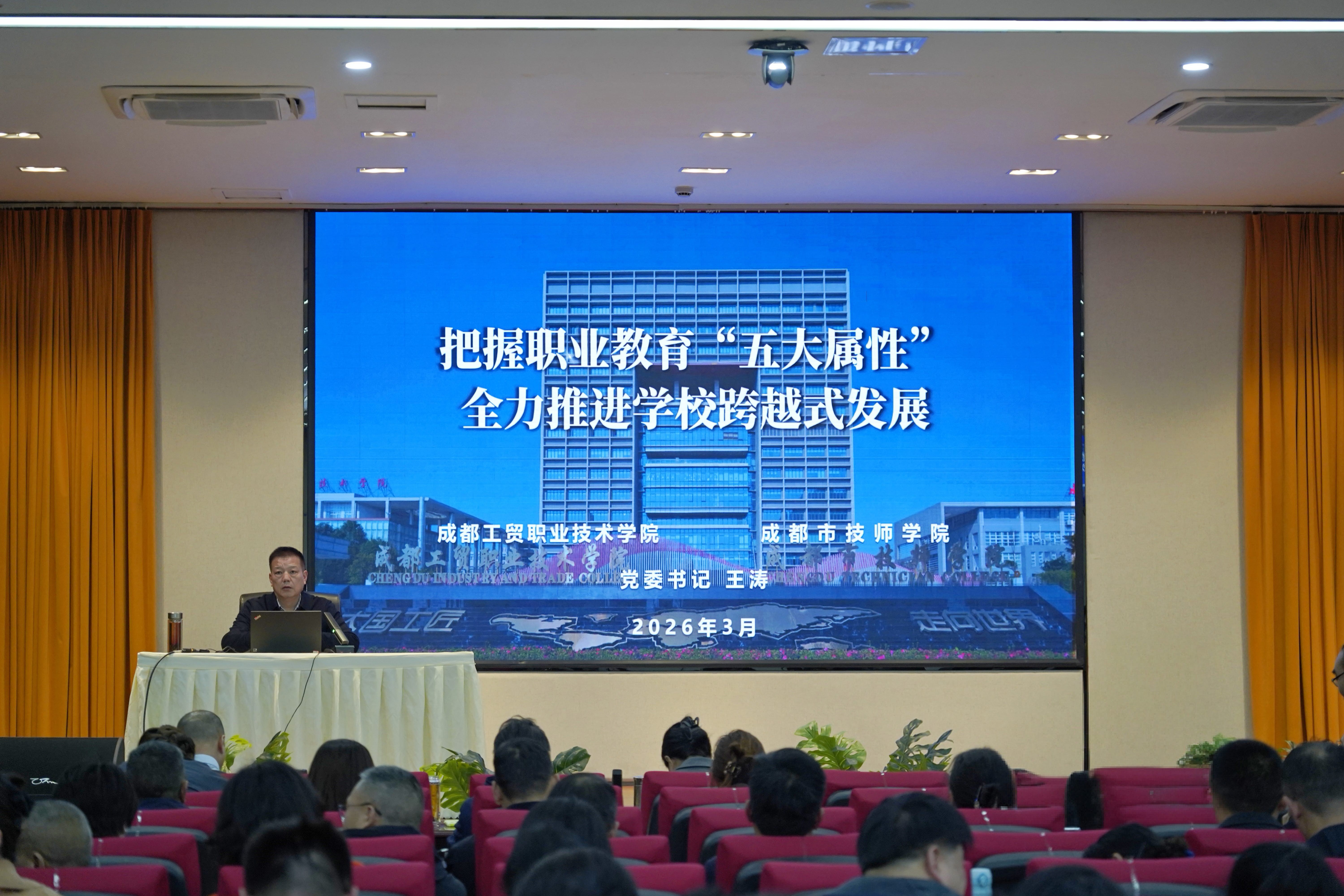3月6日,学校召开2026年春季学期工作部署会。学校党委班子成员出席会议,科级及以上干部、正教授、博士、教研室主任、“立园满园”驻园教师参加会议。会议由党委副书记、校长杨莉主持。党委书记王涛以《把握职业教育“五大属性”,全力推进学校跨越式发展》为题作专题培训。王涛在专题培训中,围绕职业教育的“政治属性、区域属性、产业属性、教育属性、开放属性”五个方面,结合学校发展实际与办学特色,从抓实党建品牌,打造“职教味道”特色马院、探索“职—技”融通发展的职教体系构建、优化专业布局,融入园区办学、全覆盖实施“工学一体化”教学改革以及“一院一品”国际班行动等方面,全方位、深层次剖析职业教育发展和学校跨越式发展的路径。王涛要求,全体干部要以此次培训为抓手,把职业教育五大属性贯穿办学治校全过程,深化教育教学改革,强化产教融合、校企合作,不断提升人才培养质量,以实干担当推动学校职业教育实现跨越式发展,为区域经济社会发展培养更多高素质技术技能人才。杨莉以“收心聚力、开局争先”为主题作讲话。她指出,2026年是